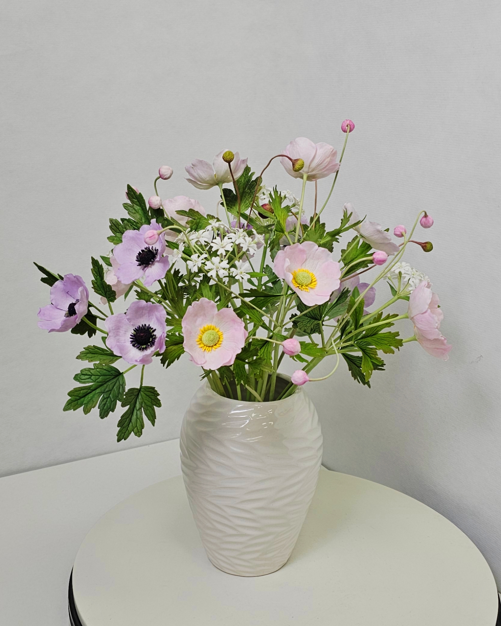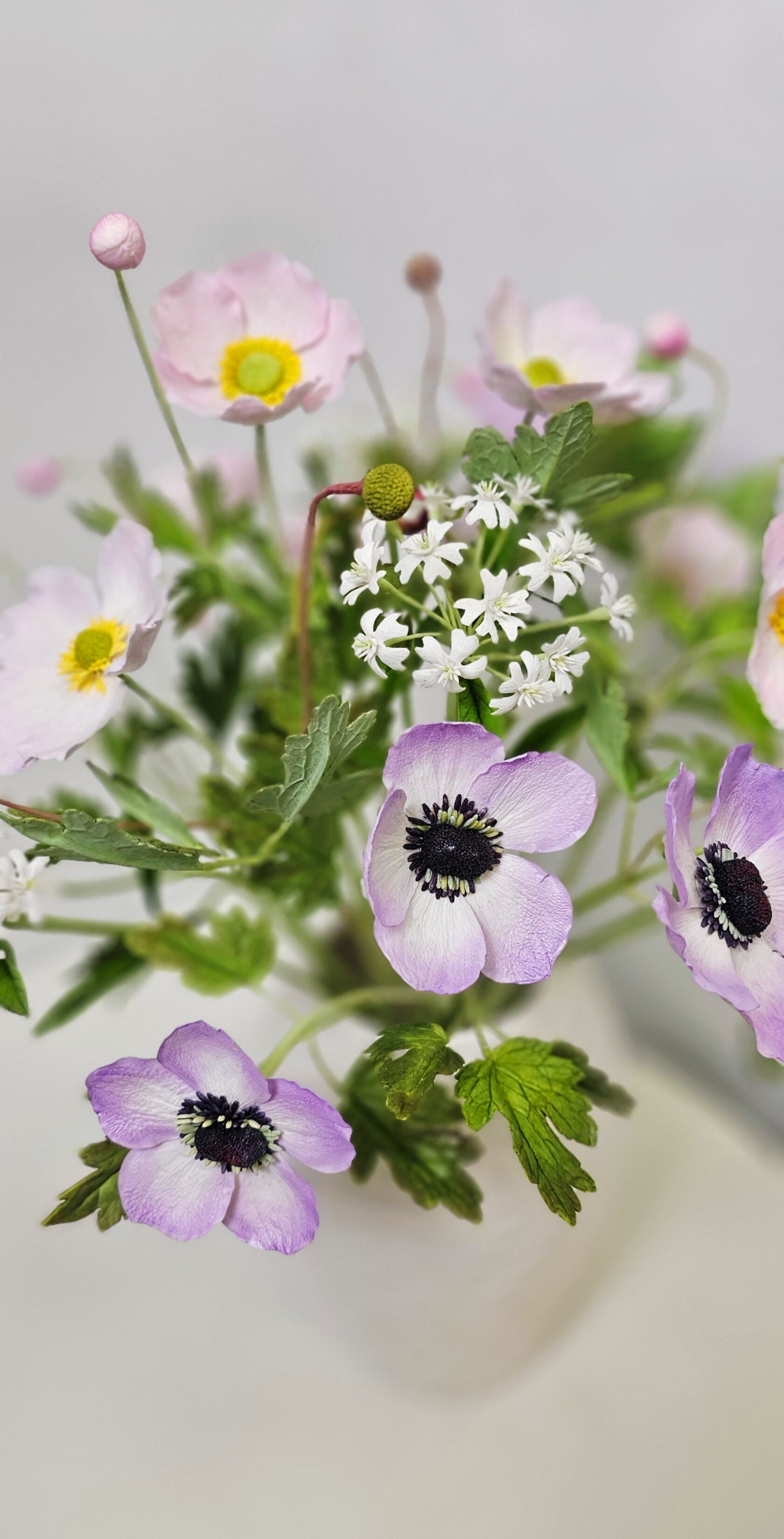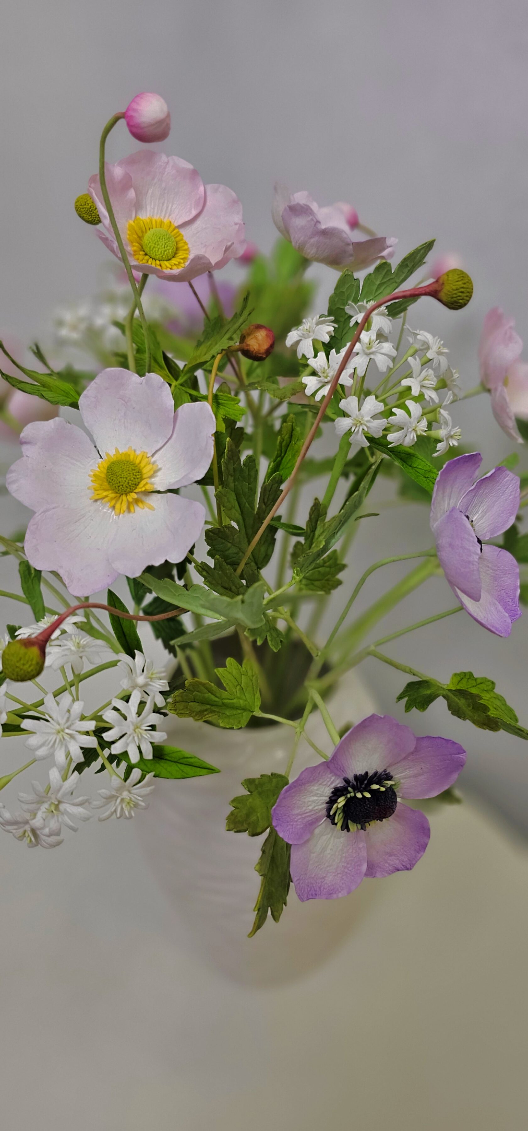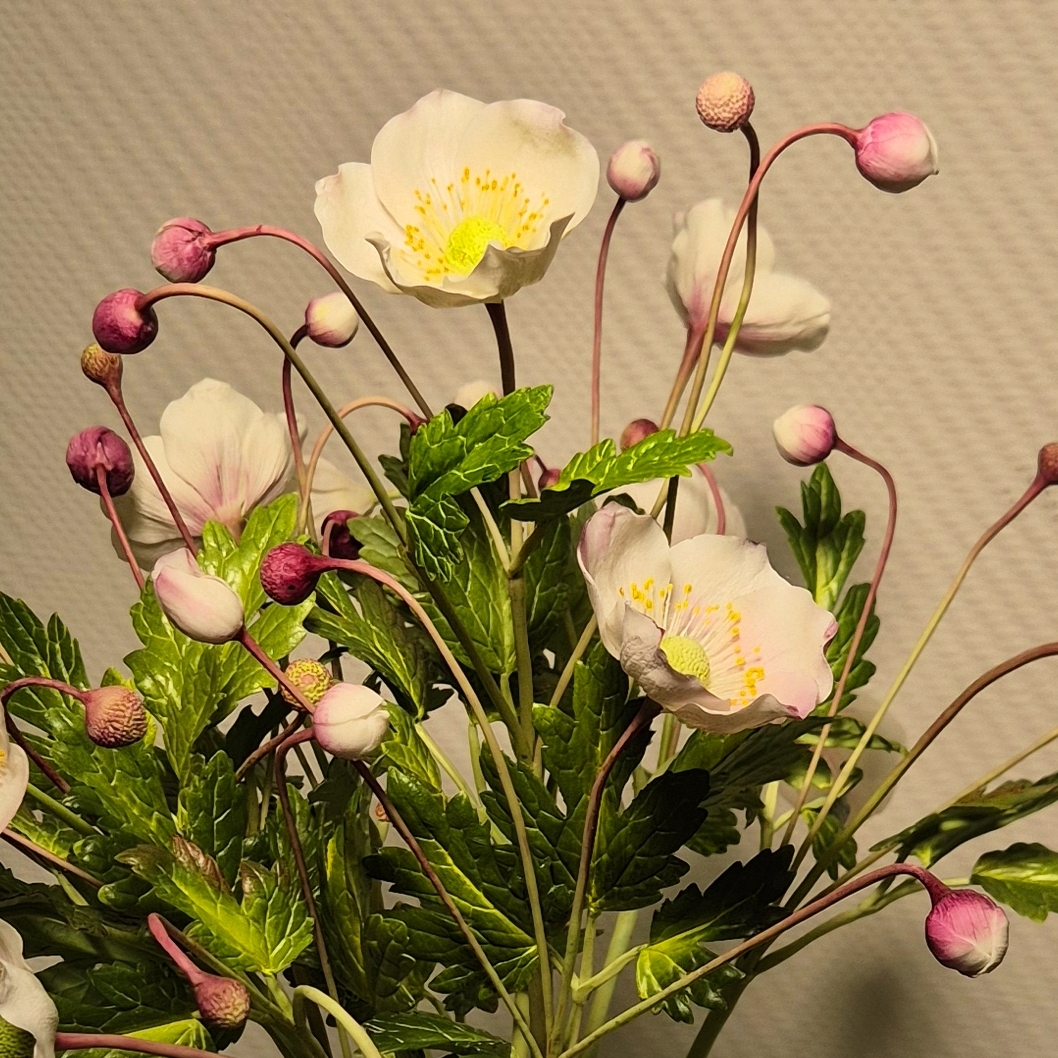 В букете 9 веток анемонов с бутонами и листьями. Возможно изготовление любого количества веток. Высота композиции примерно 50 см
